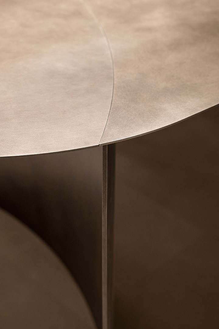 Tavolo da pranzo moderno interamente in metallo. L’originale curvatura delle gambe viene ripresa sul top con un elegante taglio che ne richiama la forma.